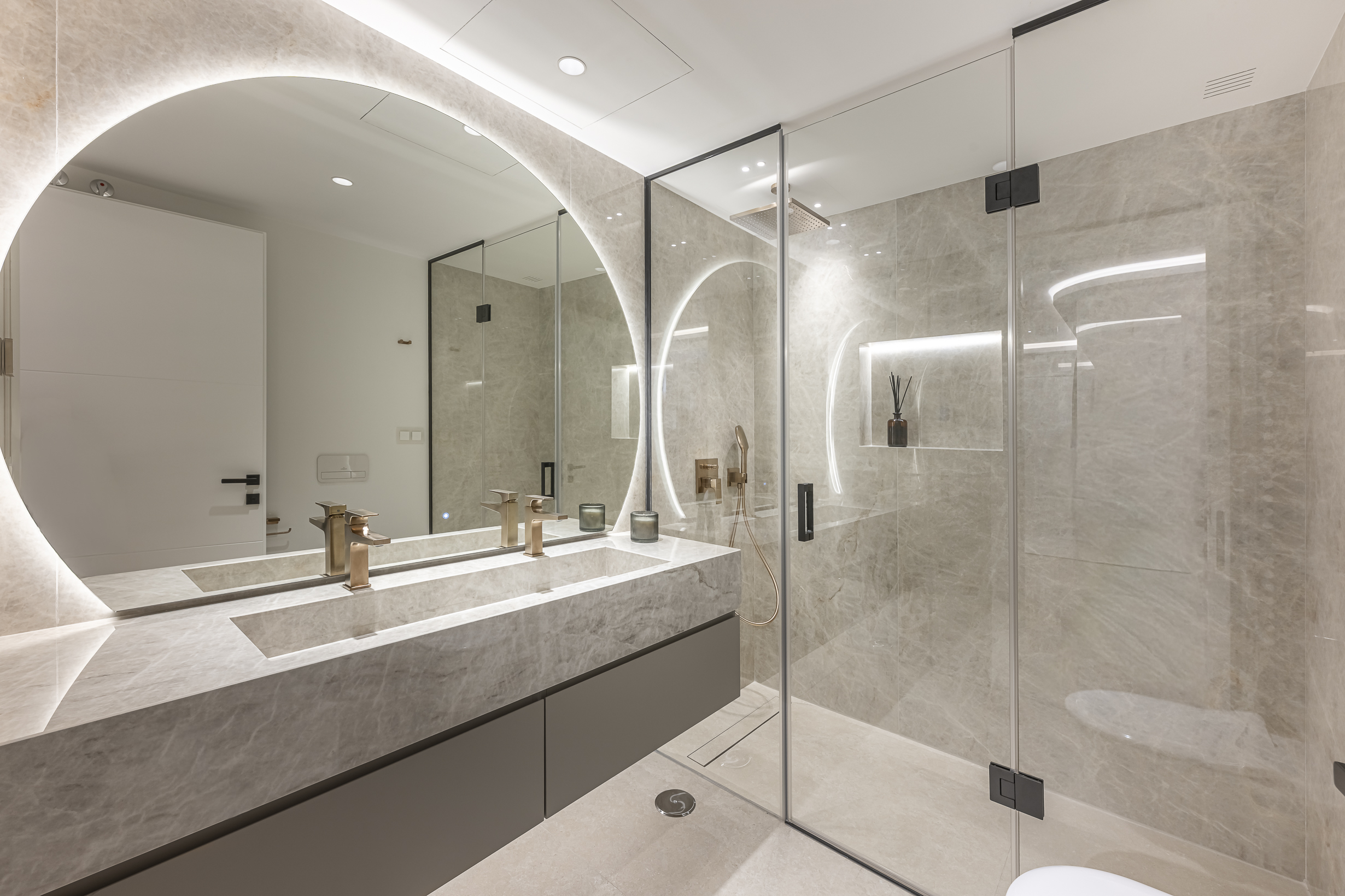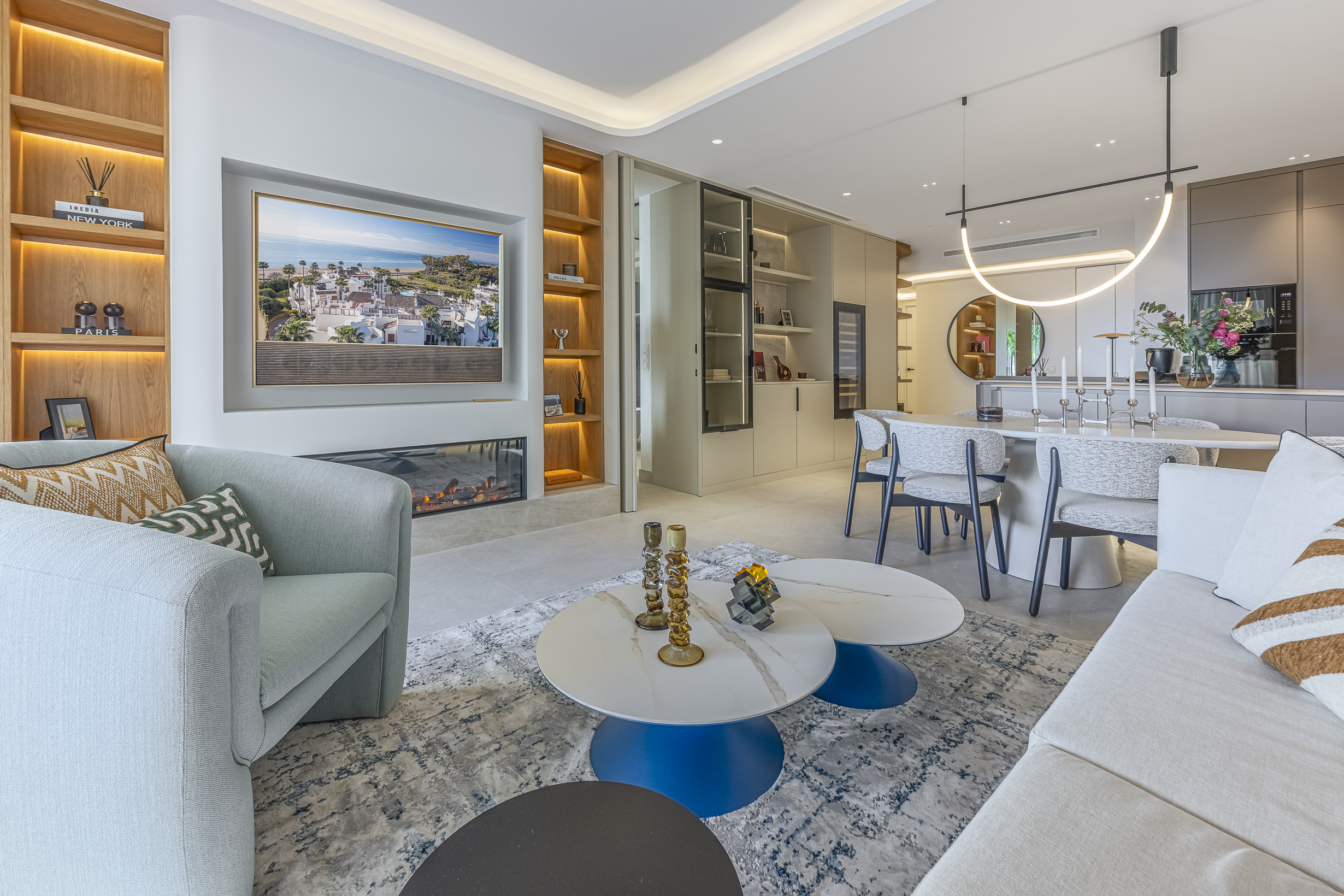 The apartment is enhanced by a range of luxurious features, including an open-plan designer kitchen fitted with premium German appliances, high-quality flooring, elegant contemporary furnishings, an electric fireplace, a Bang & Olufsen sound system, and bespoke built-in wardrobes.